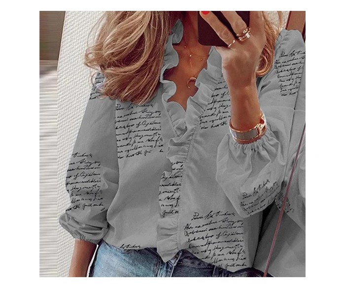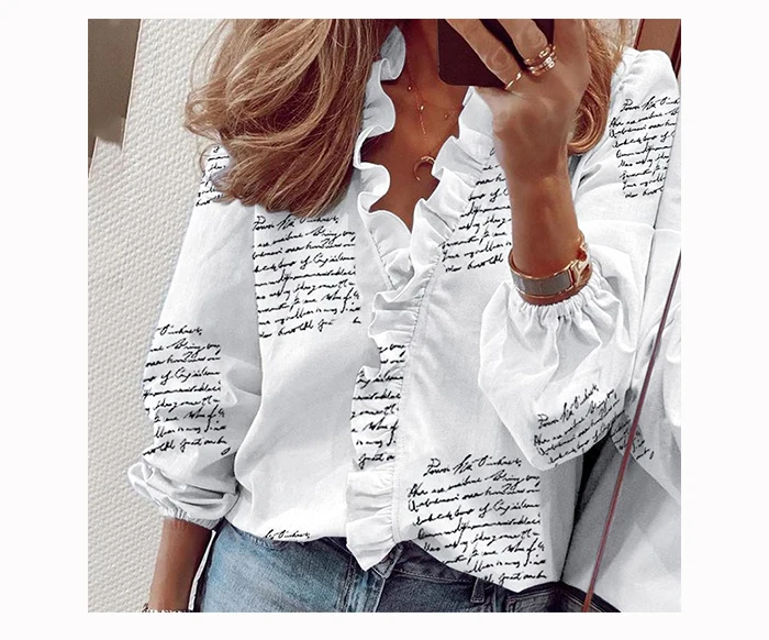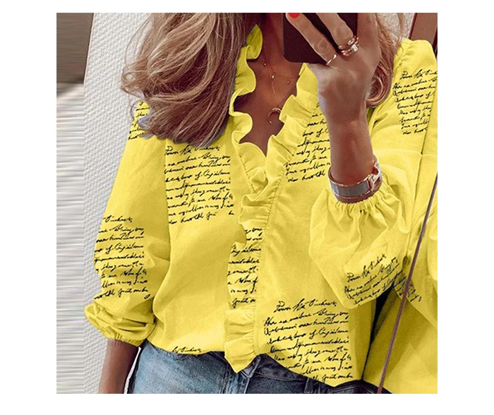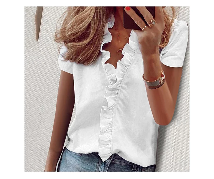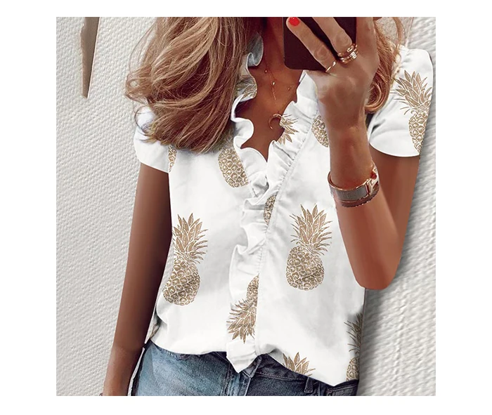 Floral Print Ruffles Women Blouse Office Lady Short Sleeve V Neck Shirts Casual Loose Elegant Basic Tops