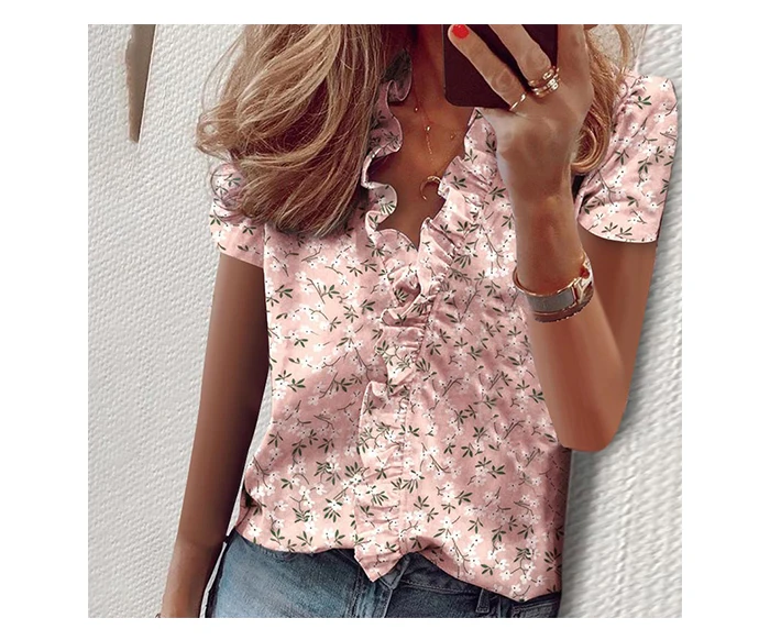 Floral Print Ruffles Short Sleeve V Neck Shirts