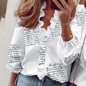 Floral Print Ruffles Women Blouse Office Lady Short Sleeve V Neck Shirts Casual Loose Elegant Basic Tops